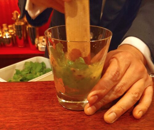 ※5 パッションフルーツのモヒートをつくる途中。ミントの葉を潰して、香味を加える。