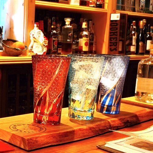 美しい江戸切子調の、形は同じ色違いのグラスが、3つカウンターに並んだ。